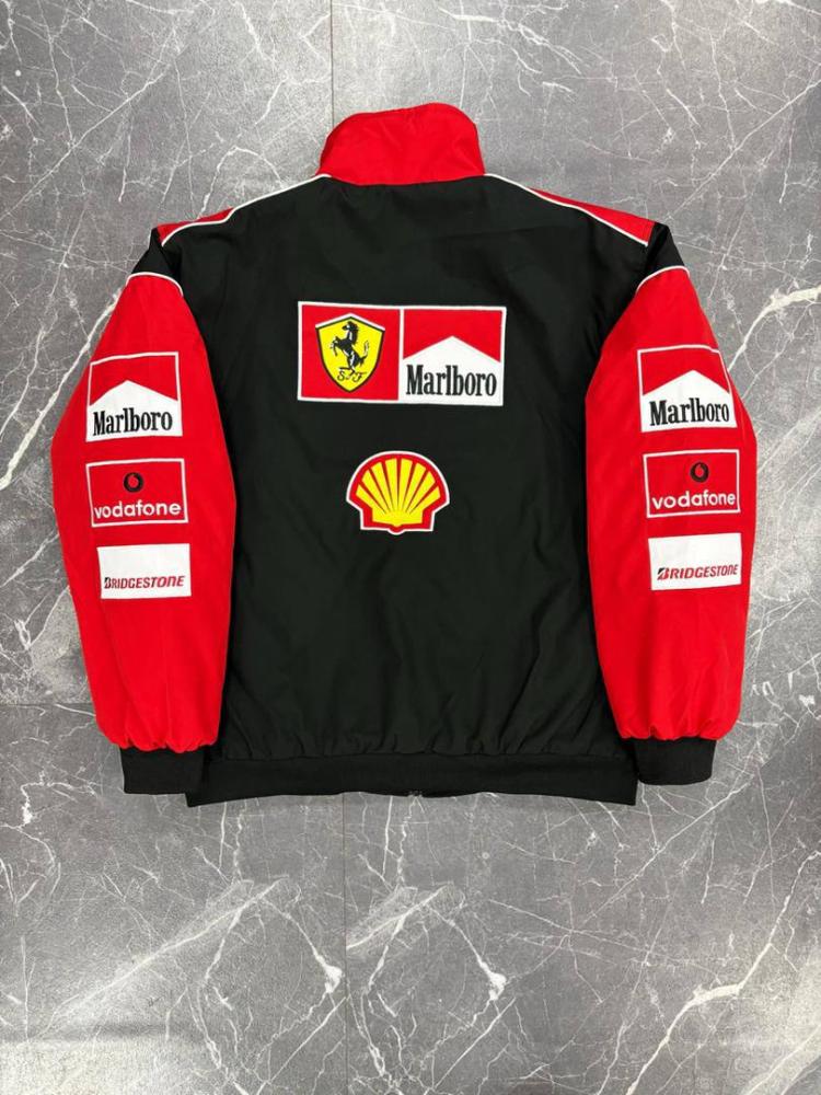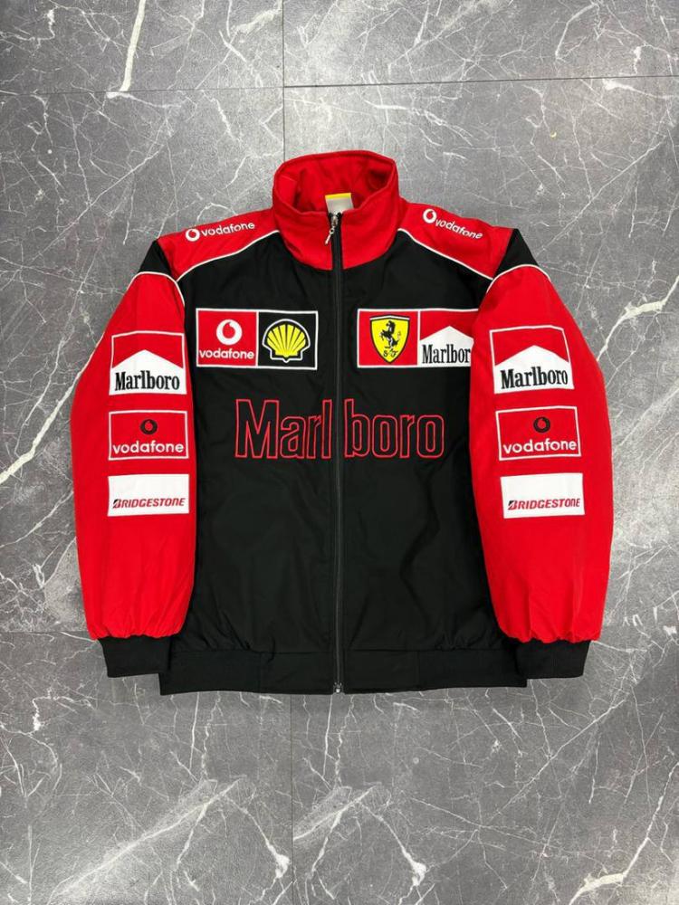 جاكيت فيراري مارلبورو بتصميم أسود وأحمر مستوحى من روح سباقات الفورمولا 1. مصنوع بجودة عالية وتطريز دقيق يحمل شعارات العلامات الشهيرة مثل Shell وVodafone وBridgestone وMarlboro. خيار مثالي لعشاق السيارات والستايل الرياضي الكلاسيكي.