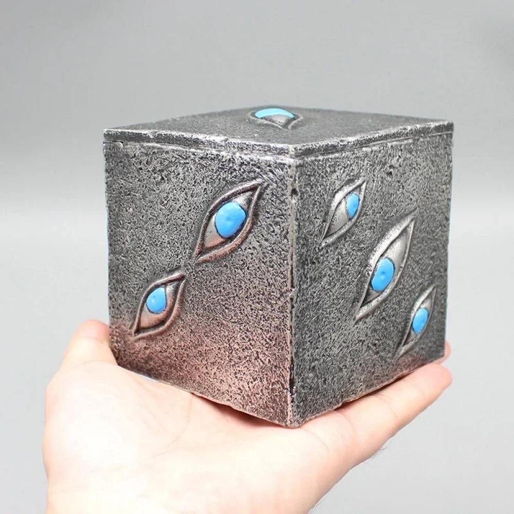 • القاعدة: مكعب زخرفي مزين بنقوش "عيون ملعونة" زرقاء