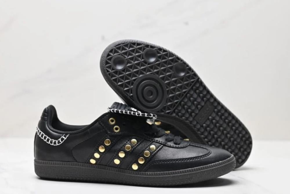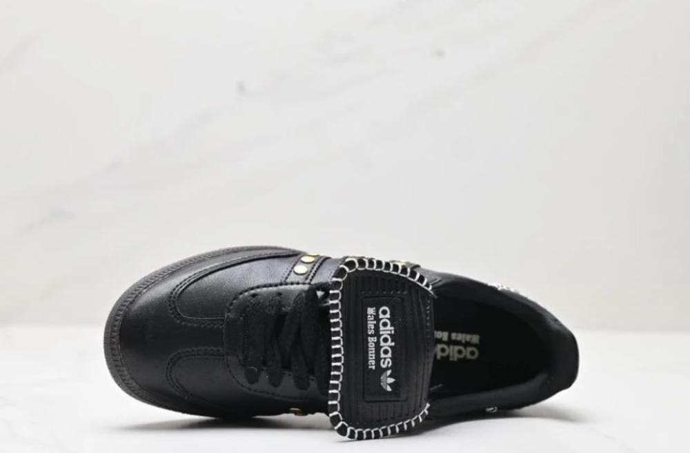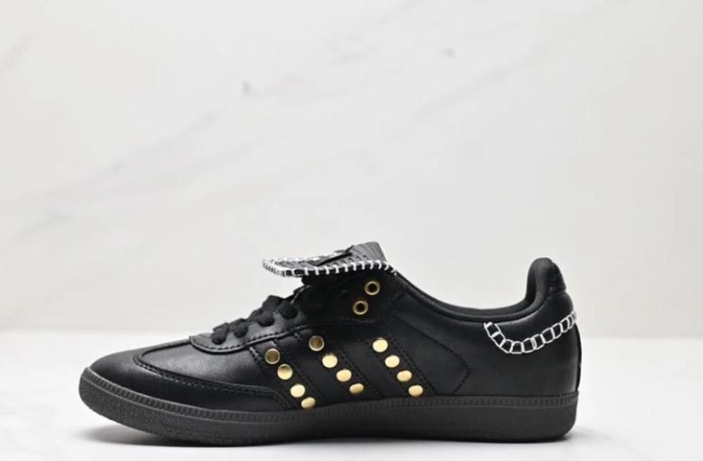 The Wales Bonner x adidas Samba "Studded Pack - Black" is a collaboration by the acclaimed fashion designer that updates the iconic retro sneaker with metallic gold studs. The design features a Core Black leather construction with tonal leather overlays and is adorned with white stitching along the heel and a folded tongue. Underneath, a dark brown gum rubber sole.
